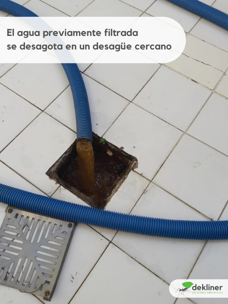 • Vaciado parcial del tanque mediante succión con equipos de aspiración y/o bomba sumergible. El agua y los residuos se eliminan hacia un desagüe por desagote controlado. Previamente, el agua succionada se filtra para retener piedras, partículas y arena. Evitamos así que ingrese suciedad a las cañerías del sistema sanitario. El vaciado parcial impide además que ingrese aire a las cañerías, evitando problemas posteriores con la presión de agua